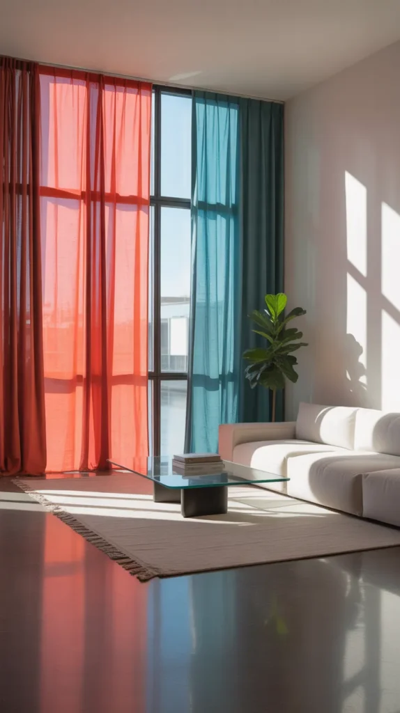 Sheer or solid colorful curtains add softness and color to minimalist apartments. They frame windows beautifully and enhance natural light.