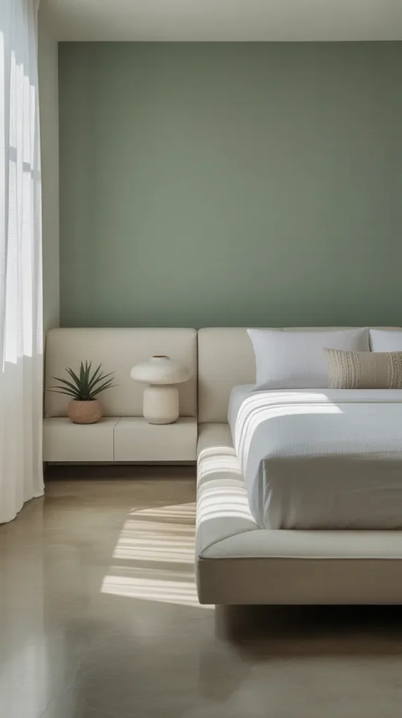 A single accent wall in a soft or bold color adds depth to a minimalist bedroom. Keep the other walls neutral.