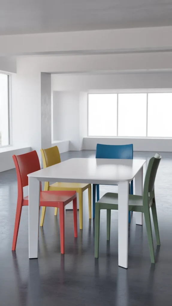 A simple dining table paired with colorful chairs creates a modern and playful look. The clean table keeps the space minimal, while chairs add personality.
