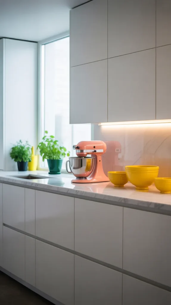 Minimal kitchens look clean and modern, but colorful accessories prevent them from feeling cold. Items like stools, cookware, jars, or towels in bright colors add charm without mess.