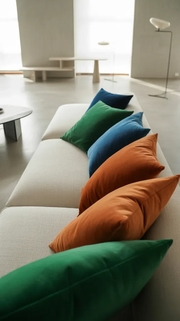 Colorful cushions are a simple way to refresh a minimalist living room. Neutral sofas act as a calm base, while cushions add warmth and style.