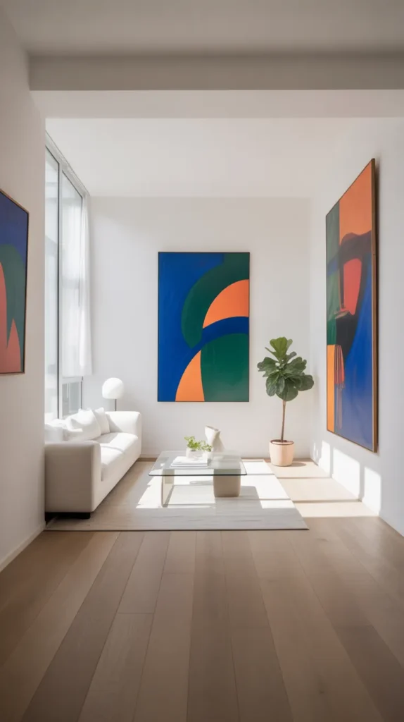 Choose abstract or modern art with strong colors like red, teal, or yellow. Keep furniture simple and low-profile. This idea keeps the apartment clean and modern while expressing personality through color.
