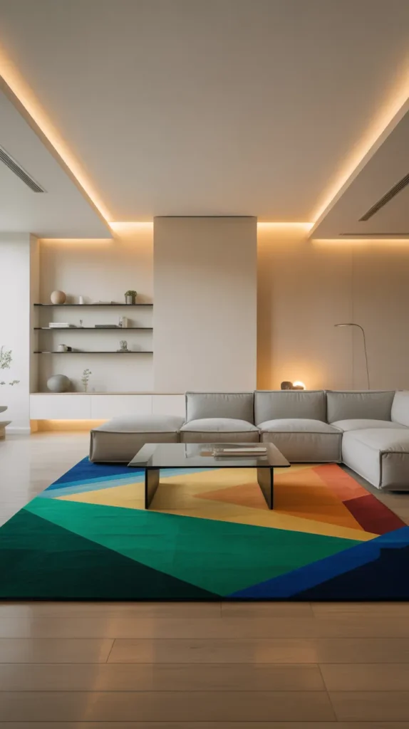 A colorful rug anchors a minimalist room and adds warmth. Neutral floors and walls allow the rug to stand out without competing with other elements.