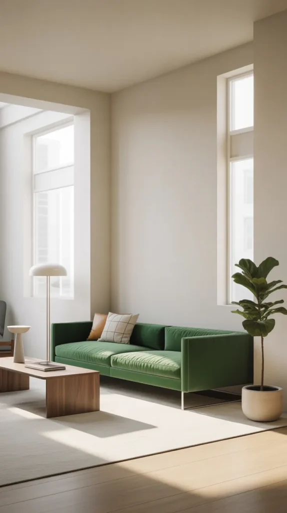 A neutral living room with a bold sofa is one of the easiest ways to mix minimalism and color. White, beige, or light gray walls keep the space calm, while a sofa in emerald green, mustard yellow, or deep blue adds strong personality. The sofa becomes the main focal point without needing extra decor.