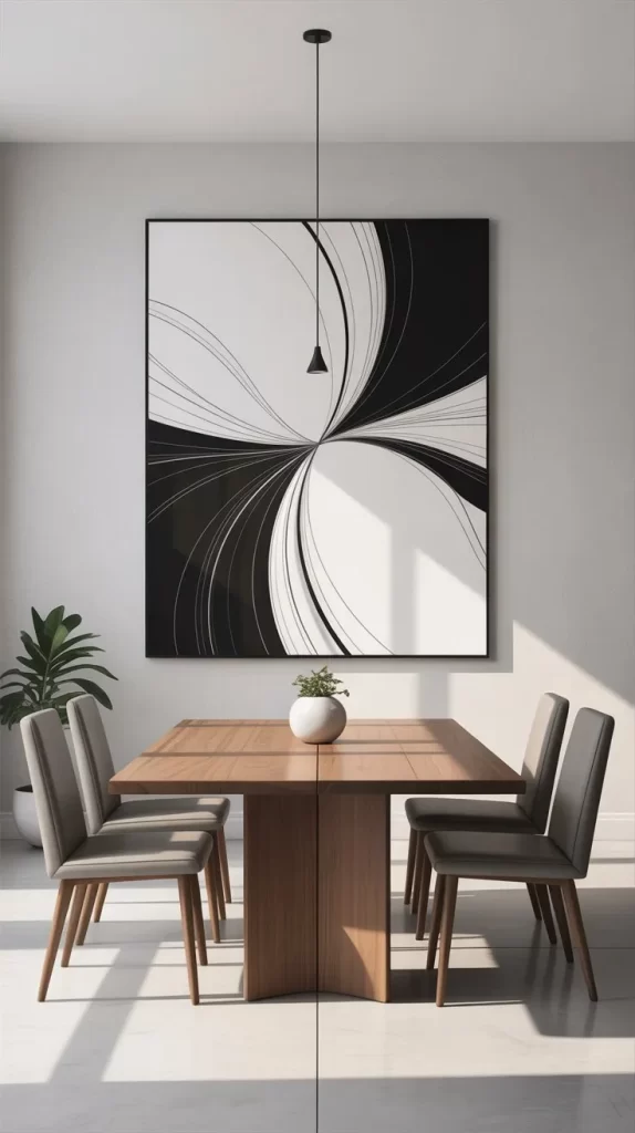 Line art brings a modern, minimalist feel. Choose simple abstract drawings in black on white or muted backgrounds. A single large piece or a small series of framed prints above the dining table can make a subtle statement without overpowering the space.
