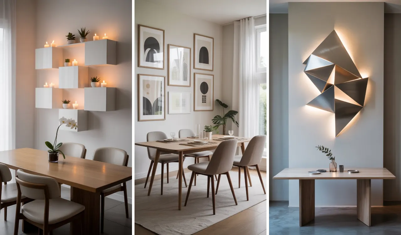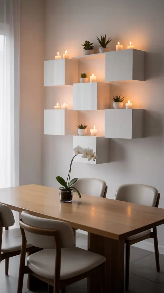 Floating wall-mounted candle holders add warmth and ambiance. Choose sleek designs in black, white, or metallic finishes. A small arrangement above the dining table can create a cozy, intimate atmosphere while keeping the wall decor minimal and stylish.