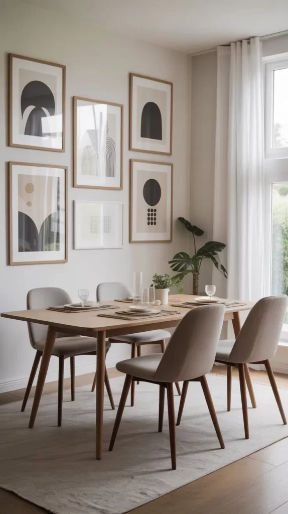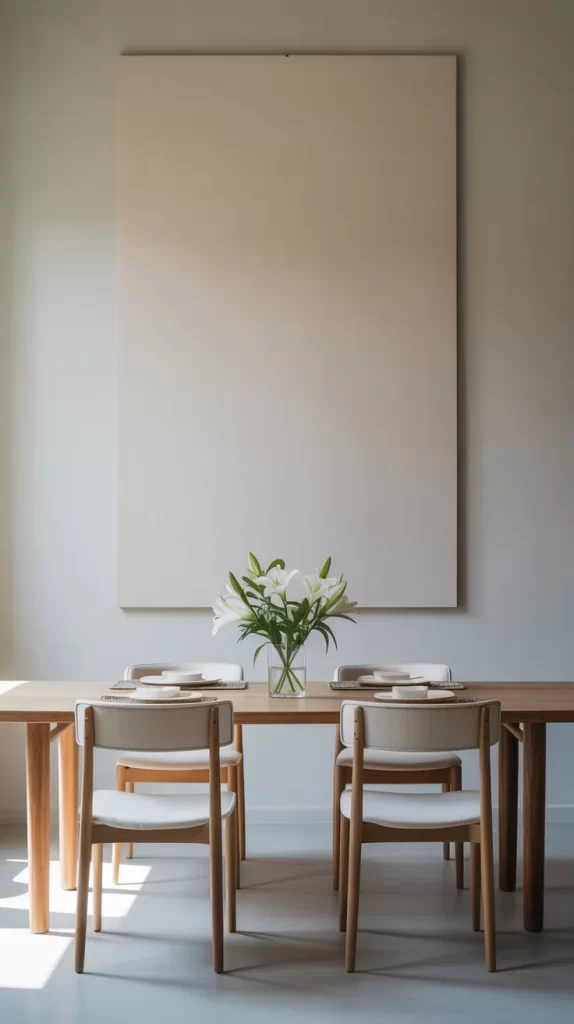 A simple, round or rectangular mirror adds light and space to a minimalist dining room. Choose a frame in black, wood, or metal for subtle sophistication. Mirrors make the room feel larger and reflect natural light, enhancing the clean style while keeping decor minimal.