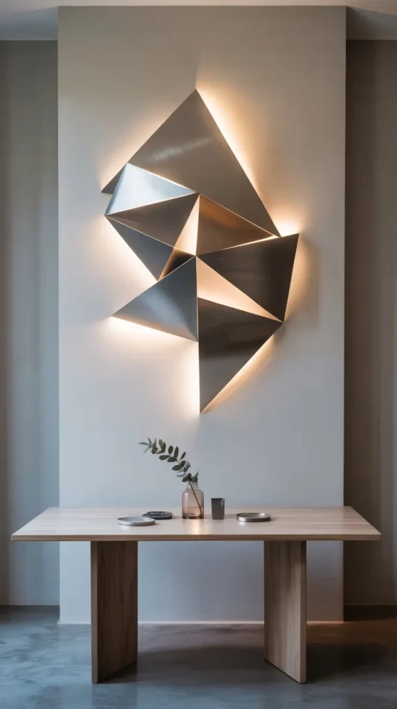 Simple metal sculptures in geometric or abstract shapes add elegance. Choose muted finishes like black, gold, or silver for a subtle accent. Hang a single sculpture or a small arrangement above the dining table for a refined, minimalist look.