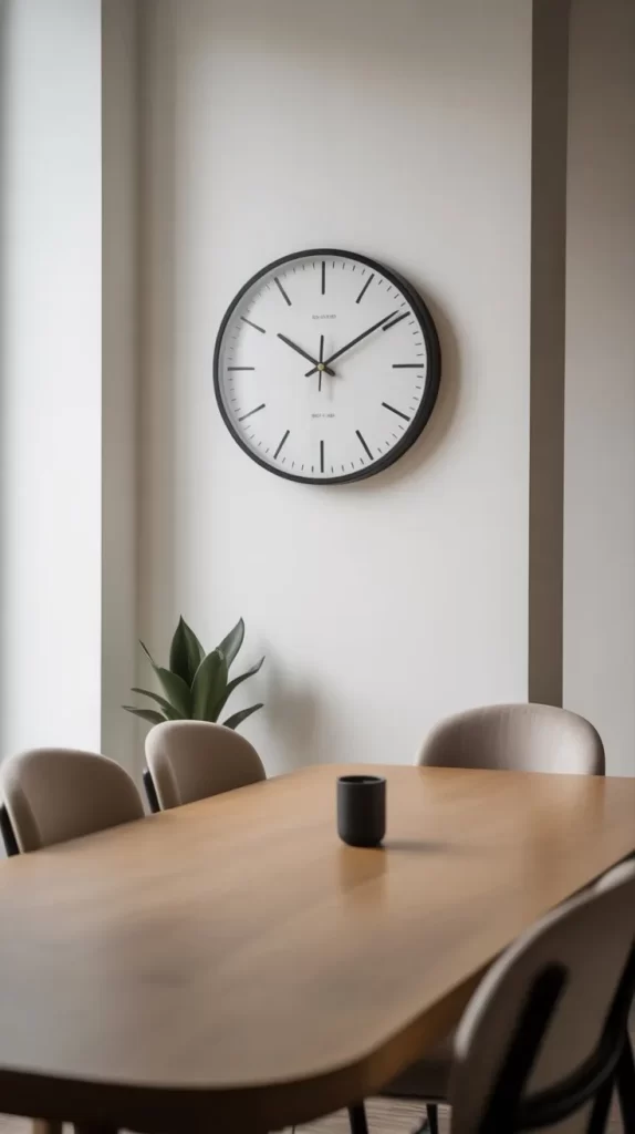 A sleek, modern wall clock acts as decor and function. Choose designs with simple lines, neutral colors, and no numbers or minimal markings. A wall clock above the dining table adds style without overwhelming the space.