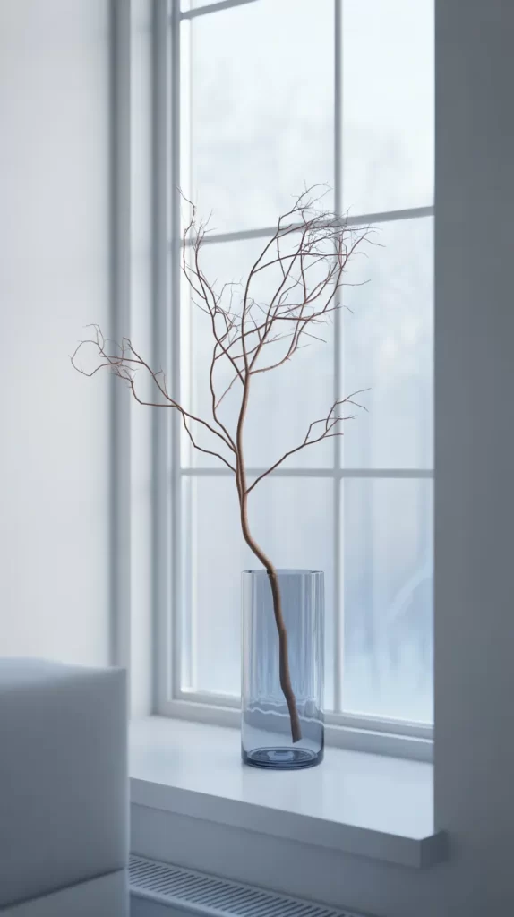 Place a simple bare branch in a clear glass vase near the window. The branch’s natural shape becomes a beautiful silhouette against the light. You can leave the branch bare or add one or two tiny ornaments for a soft touch.