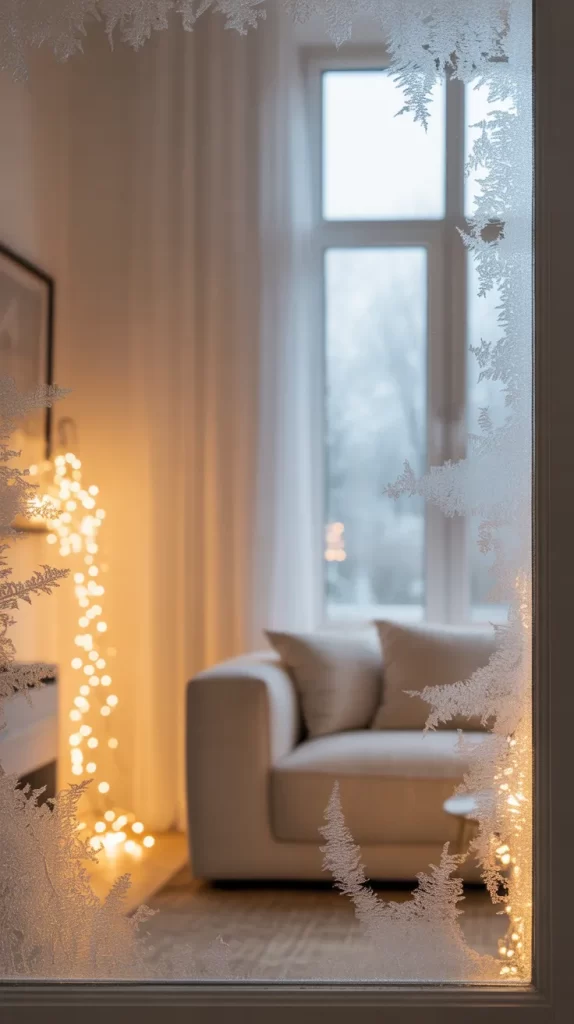 This idea works especially well in bedrooms or reading corners. It adds a gentle winter feeling without adding physical items to your space. Frosted windows pair nicely with white blankets, wood accents, and natural greenery. This design makes the home feel peaceful and warm.