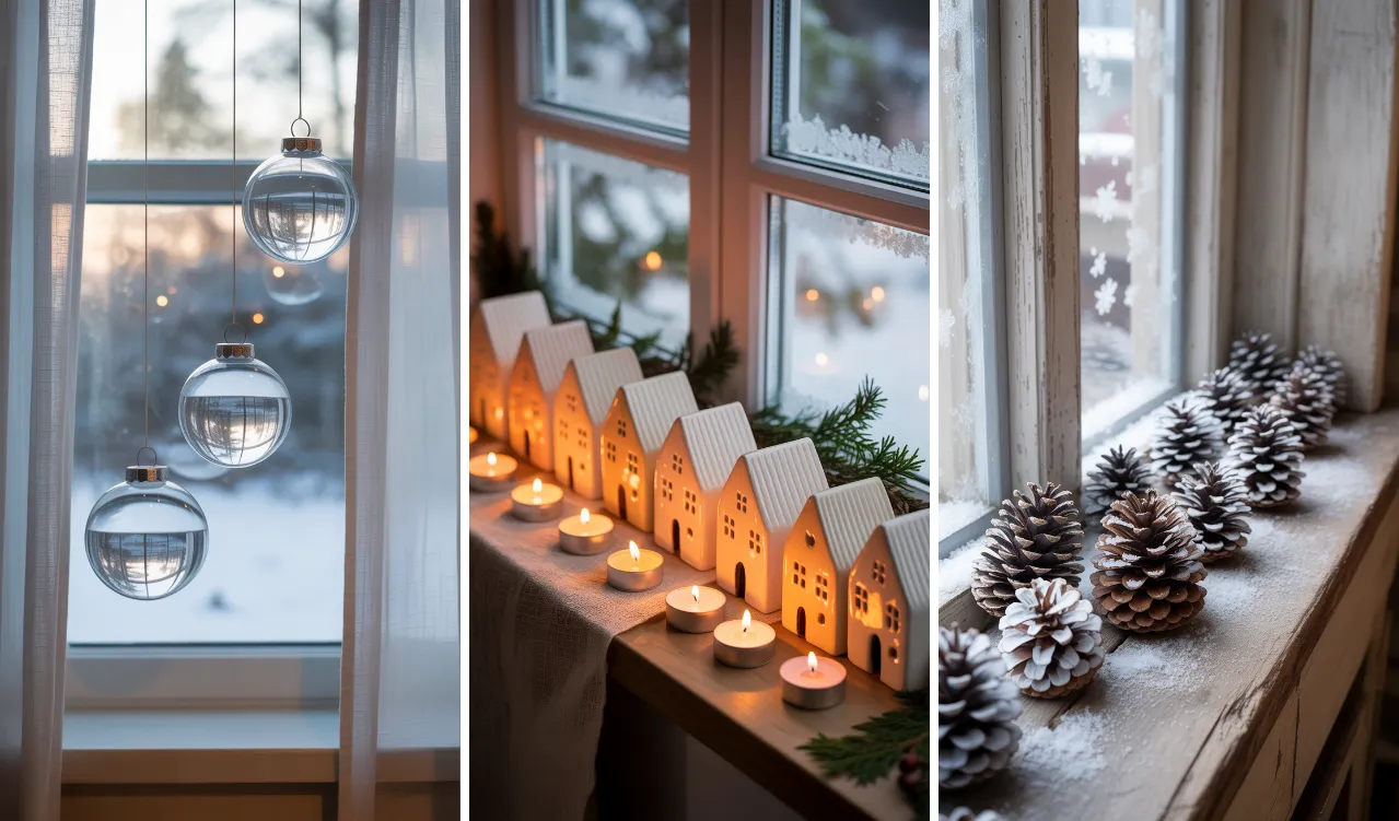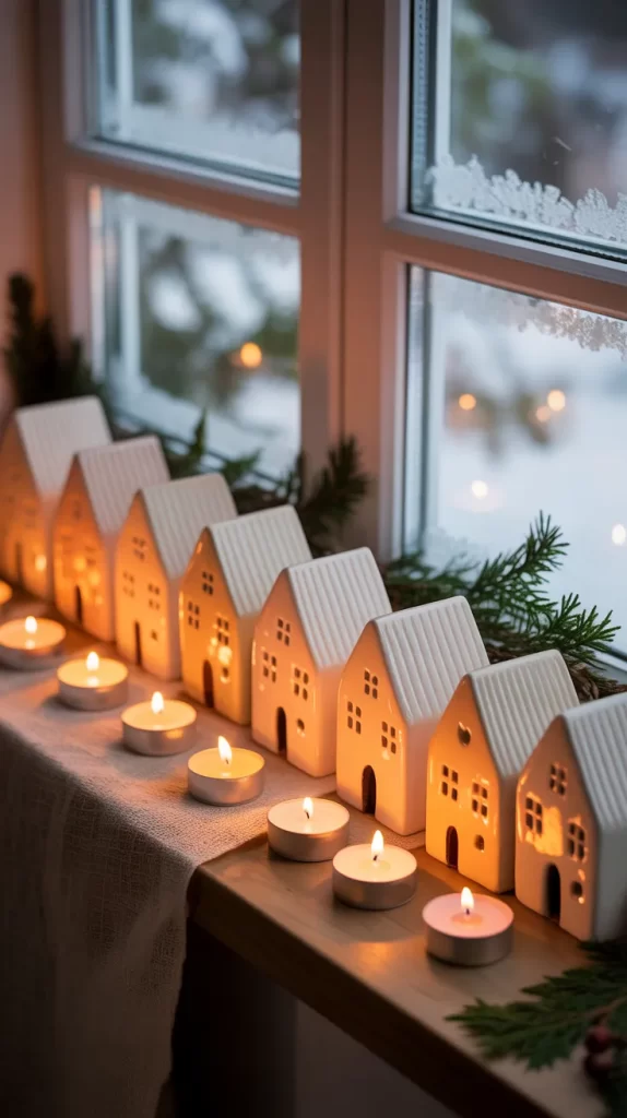 Small ceramic houses arranged on the windowsill create a tiny winter village scene. Keep the colors neutral — white or beige works best. You can add one or two tea lights behind them for a soft glow.