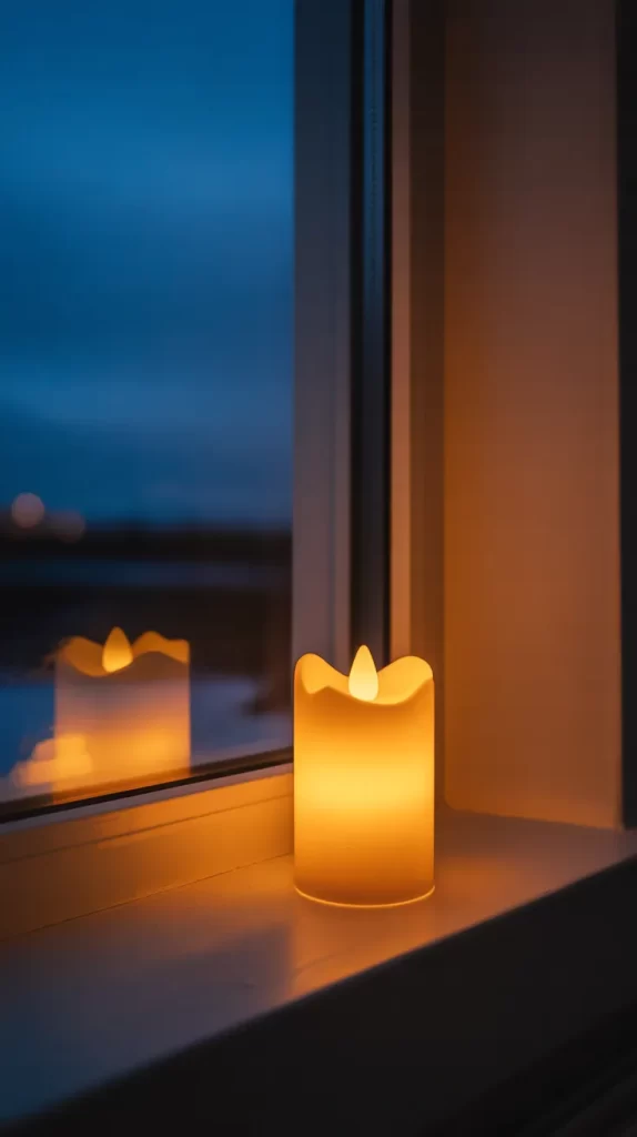 Window candles create a warm, gentle glow during winter nights. A single slim candle placed in the center of each window creates a simple and classic holiday look. Electric or LED candles are safe and easy to manage while still looking timeless. The soft light adds warmth without overpowering the room.