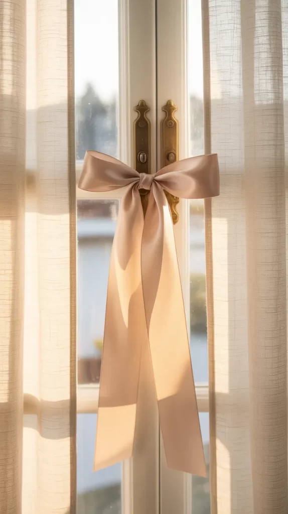 A single ribbon tied into a bow is one of the most understated yet elegant window decor options. Choose satin or linen ribbon in neutral tones like white, beige, or soft gold. Place it at the center or corner of the window for a clean accent.