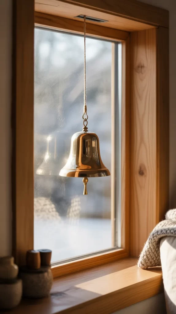 A single metal bell hanging in the window creates a gentle winter detail. Choose bells in brass or silver tones for a classic and simple style. It adds a subtle sound when the wind moves.