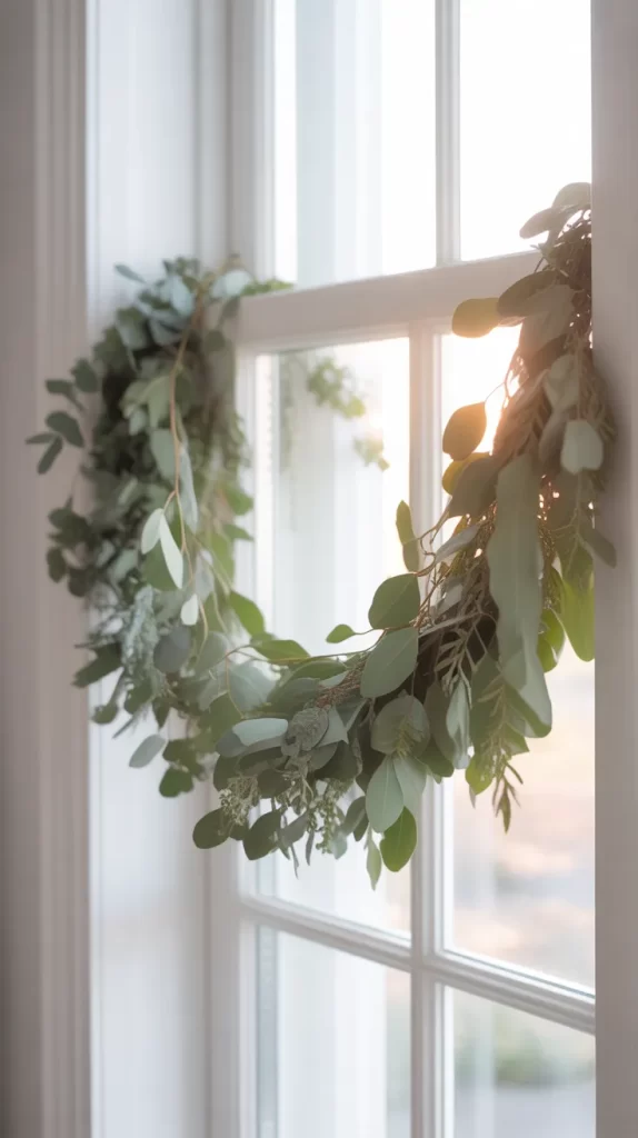 A thin garland made of pine or eucalyptus adds a natural holiday touch. Instead of full, thick garlands, choose a narrow strand to maintain a clean look. Drape it lightly across the top of the window or along the sill. The greenery softens the edges of the space and connects the room with the outdoors.