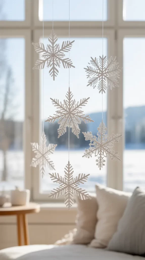 This idea is especially budget-friendly and family-friendly. You can make snowflakes with kids or enjoy folding and cutting them yourself. Keep the color white for a clean look. Pair them with simple candles or neutral pillows in the room to create a soft winter scene.