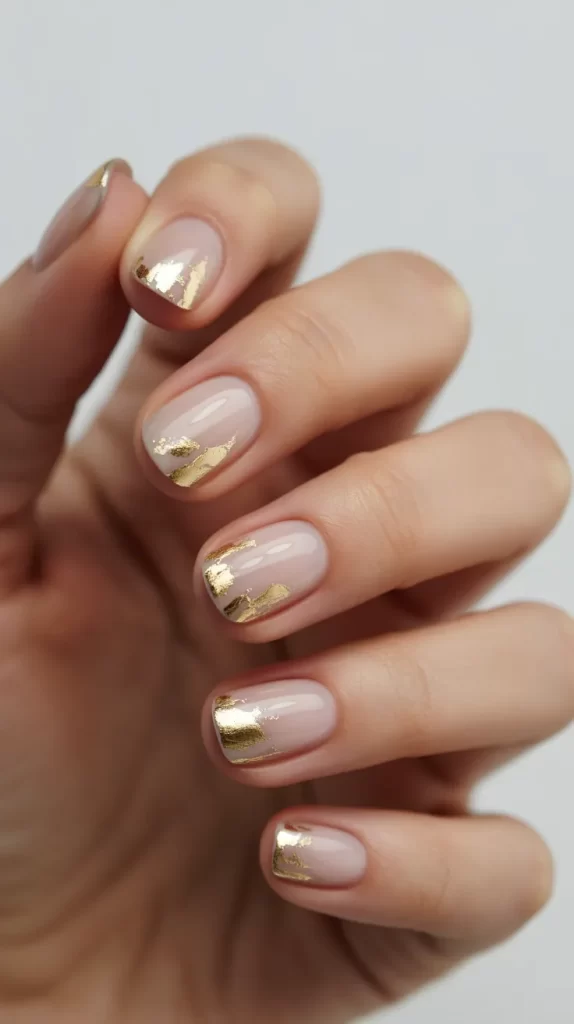 Go for a nearly clear or extremely sheer base coat. Then apply thin strips or flakes of gold foil just at the very tips of each nail — almost like a gold French tip but thinner and more textured. The foil provides a subtle sparkle without overwhelming the minimalist look.