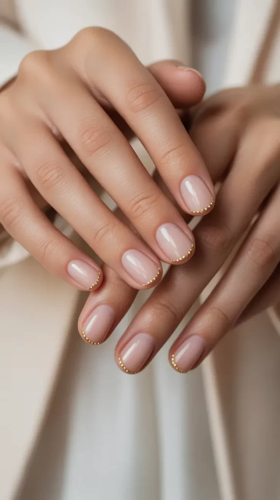 Choose an ultra-clear or extremely sheer base coat so your natural nail shows through. Along the free edge (tip) of each nail, add a tiny row of micro gold dots (just 5-6 per nail) — like a tiny gold border. The effect is delicate and very minimalist.