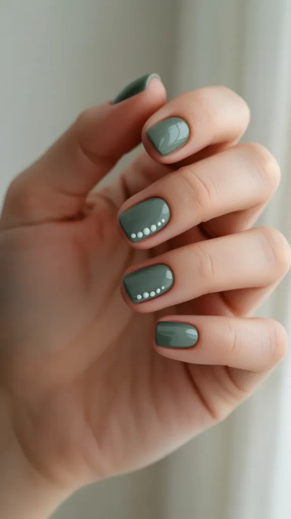 Choose a soft, muted sage-green matte polish as the base. On one corner of each nail (or just an accent nail), add a small cluster of tiny white dots (3-4) to mimic snow or falling snowflakes. The matte finish keeps the look understated and contemporary.