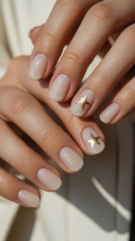 Now add a single small gold star near the cuticle or corner of one accent nail (or two). The star is a subtle nod to the season — like a star on top of a tree — without turning your nails into heavy holiday art. The result is elegant, minimalist, and still fun.