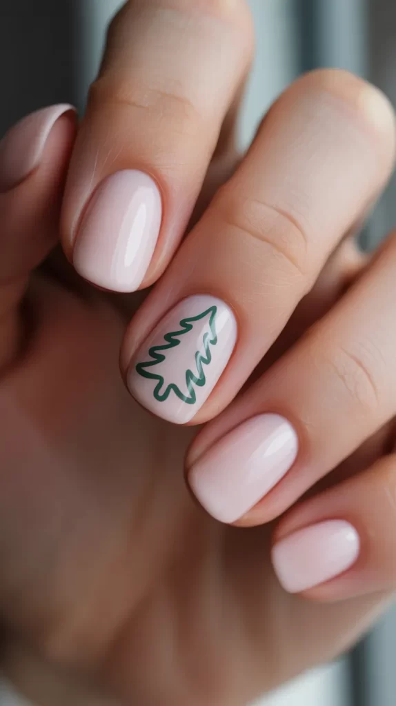 Use a milky pink or sheer blush base. On the ring finger, draw a fine, simple green outline of a small evergreen Christmas tree – just a triangle or hint of tree, no heavy fill. The outline keeps things light and airy while giving a nod to the festive season.