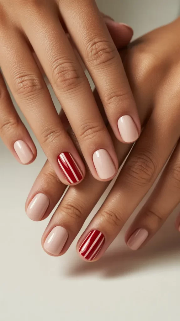 Begin with a nude or soft blush base across all nails. On one accent nail, paint a very fine diagonal stripe in classic candy-cane red and white — just one thin stripe, not multiple. This keeps the holiday reference clear but the overall look restrained and modern.