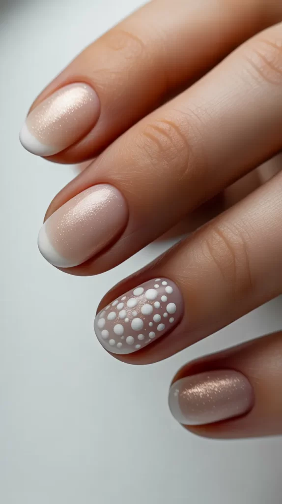 15. Nude Base with Matte White Tiny Snow-Dot Pattern on One Accent Nail