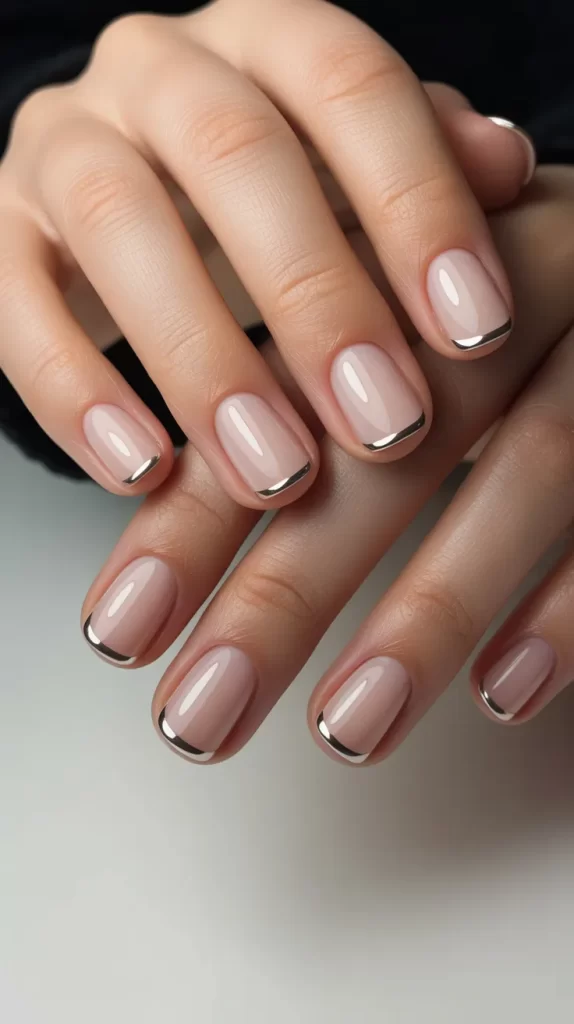 Apply a nude base all over the nails. Then add a very thin chrome silver line horizontally across each nail (or just accent nails) — roughly one-third from the tip. The silver line acts like a refined holiday stripe: subtle, reflective, and modern.