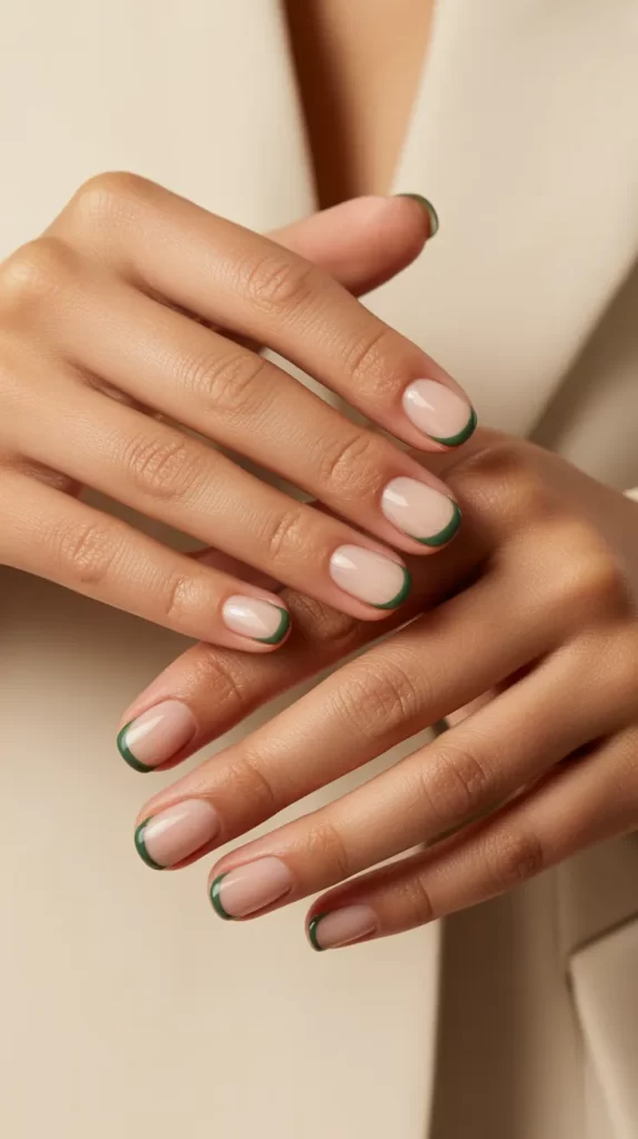 Because the tip is so thin and the rest of the nail is nude, the look works for both casual days and holiday dinners. You don’t need embellishments, glitter or heavy decorations — just a crisp line of green. This keeps your nails modern and effortless, yet beautifully festive.