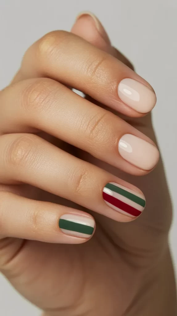 Start with a nude base for all nails. Then on a single nail (commonly the ring finger), draw two ultra-thin vertical pin-stripes — one red, one green — at the side edge of the nail. The stripes should be very fine and spaced, giving the barest hint of Christmas colours.