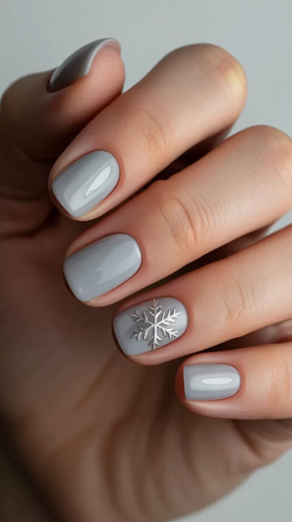 7. Sheer Grey Base with Tiny Silver Snowflake on Accent Nail