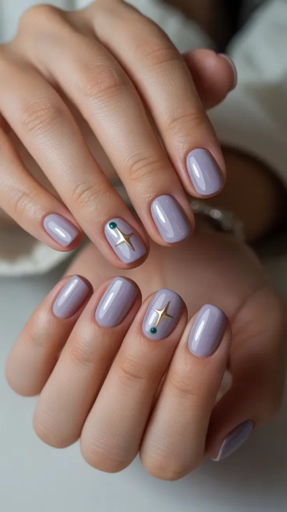 Select a sheer lilac-lavender base – light and cool. On two accent nails, place a small gold star near the cuticle and just above it a tiny green dot. The layered but simple motif gives a fresh holiday feel without being “traditional red / green.”