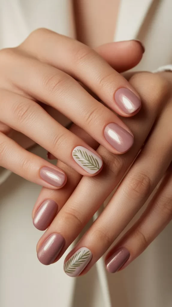 13. Sheer Mauve Base with Single Evergreen Leaf Outline on Accent Nail