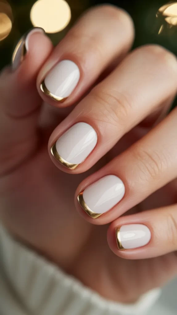 Because the design uses a single colour change and a clean shape (the half-moon), it fits the minimalist aesthetic. The ivory and gold combo is elegant and seasonal. It works especially well for shorter nails and gives a polished finish to your holiday look with minimal effort.