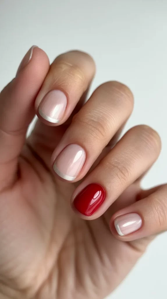 Choose a very sheer transparent or barely-there colour as your base. On one or two nails, add a small bright red dot near the outer edge or the middle — reminiscent of a holly berry or tiny ornament. This subtle red accent gives just a whisper of holiday detail without crowding the design.