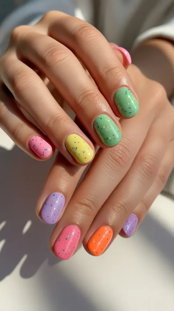 This design is perfect for summer festivals and birthday parties. You can create it at home using affordable glitter nail polish sets, making it a budget-friendly option instead of a salon visit. Buying a rainbow glitter polish kit can be a smart purchase because you can reuse the colors for many different nail designs.