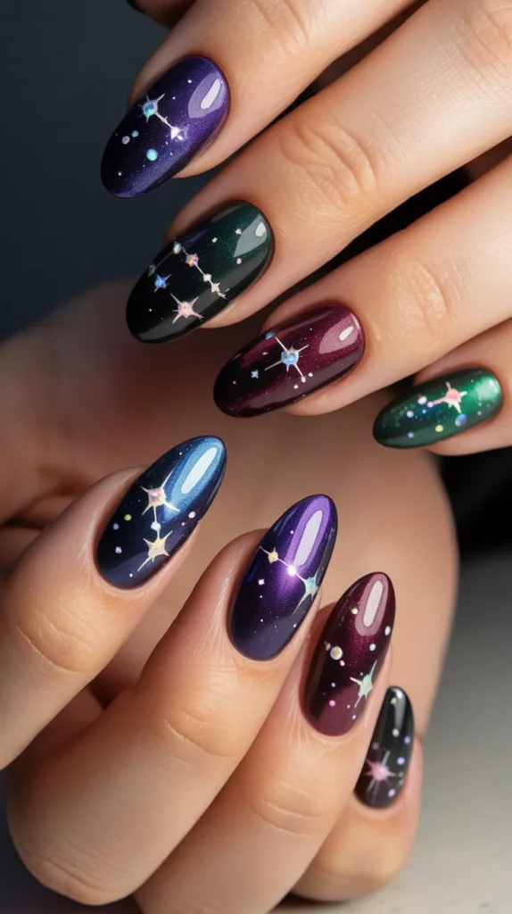 Galaxy nails are dramatic and trendy. Paint each nail a different dark base color like navy, black, deep purple, dark teal, and burgundy. Add silver and holographic glitter to create a starry sky effect.