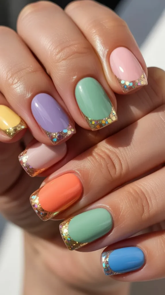 This design feels classy and feminine. Rose gold glitter polish is a smart purchase because it matches many colors. It is a budget-friendly way to create elegant multicolor glitter nail art at home.