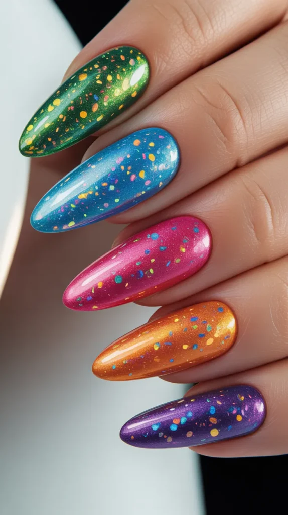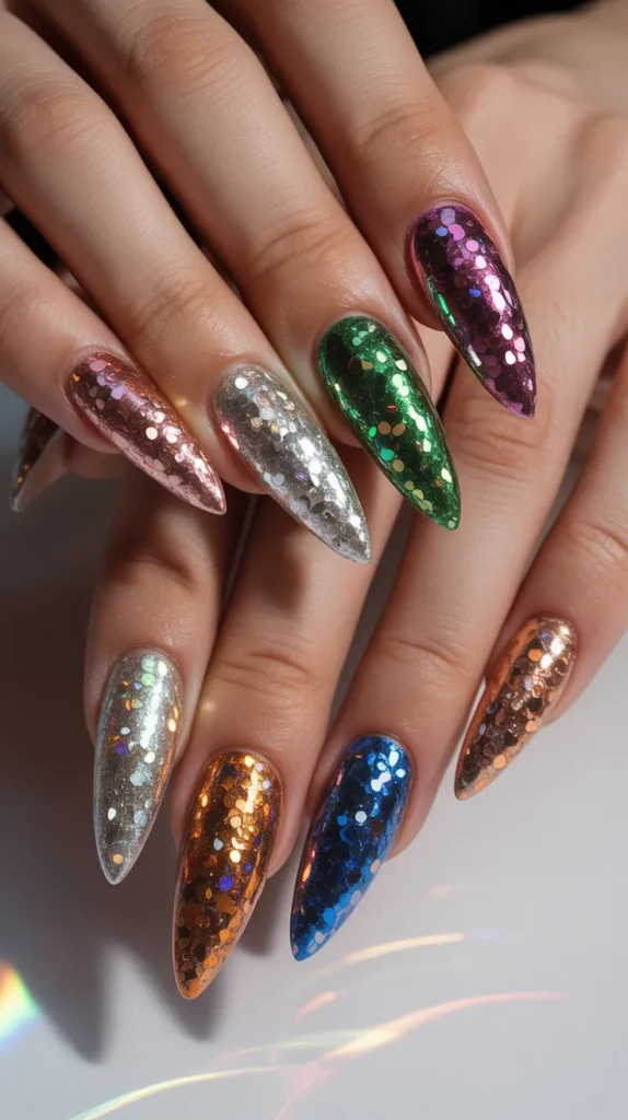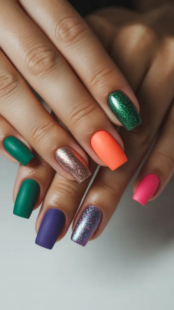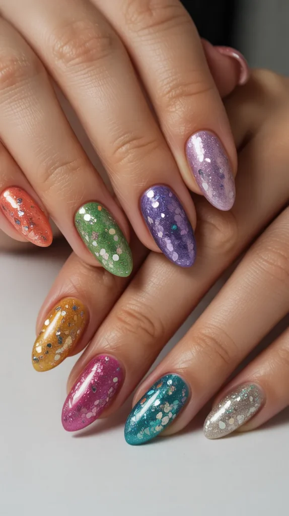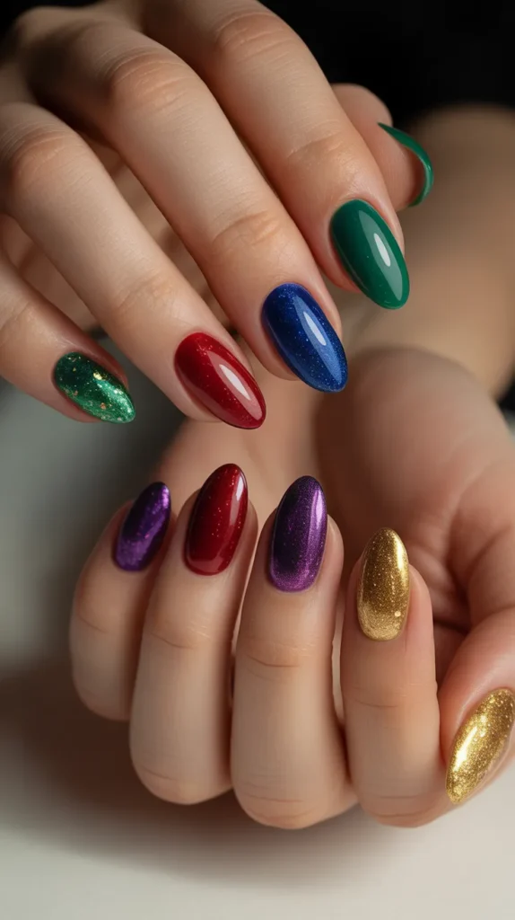 Jewel tones look rich and elegant. Paint each finger a different deep color like emerald green, sapphire blue, ruby red, amethyst purple, and gold glitter. This combination creates a luxury-inspired multicolor glitter manicure.