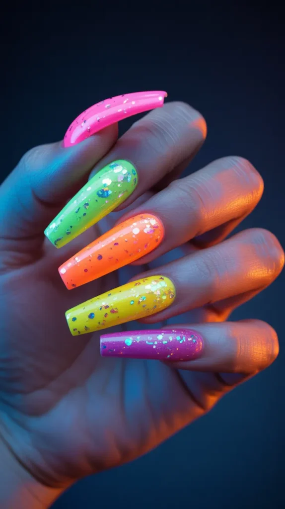 This look is ideal for vacations, music festivals, and night events. Instead of booking an expensive salon session, you can create this design at home using a neon glitter polish set. You can often find affordable nail polish collections at Walmart or Amazon, making it a smart purchase for beauty lovers who want stylish nails on a budget.