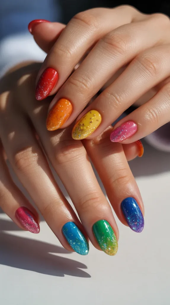 Rainbow glitter ombre nails are one of the most popular multicolor glitter nail art ideas. Paint each finger a different base color like red, orange, yellow, green, and blue. Then add a soft glitter ombre effect starting from the tip of each nail. This gives a smooth, blended sparkle look that feels bright and fun.