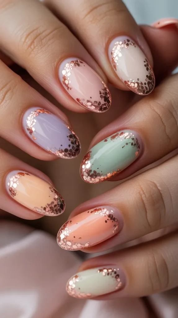Combine rose gold glitter with different color bases like blush pink, mauve, dusty blue, cream, and lavender. Each nail should be unique but tied together with rose gold sparkle.