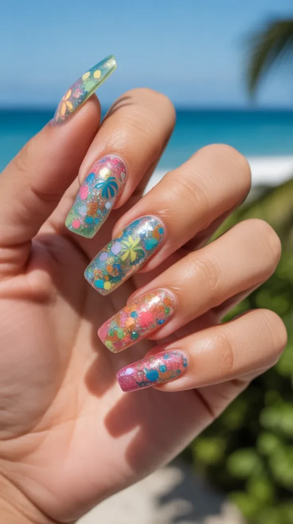 Choose tropical shades like teal, hot pink, sunny yellow, coral, and bright green. Add glitter on each nail to give a beach-ready shine.