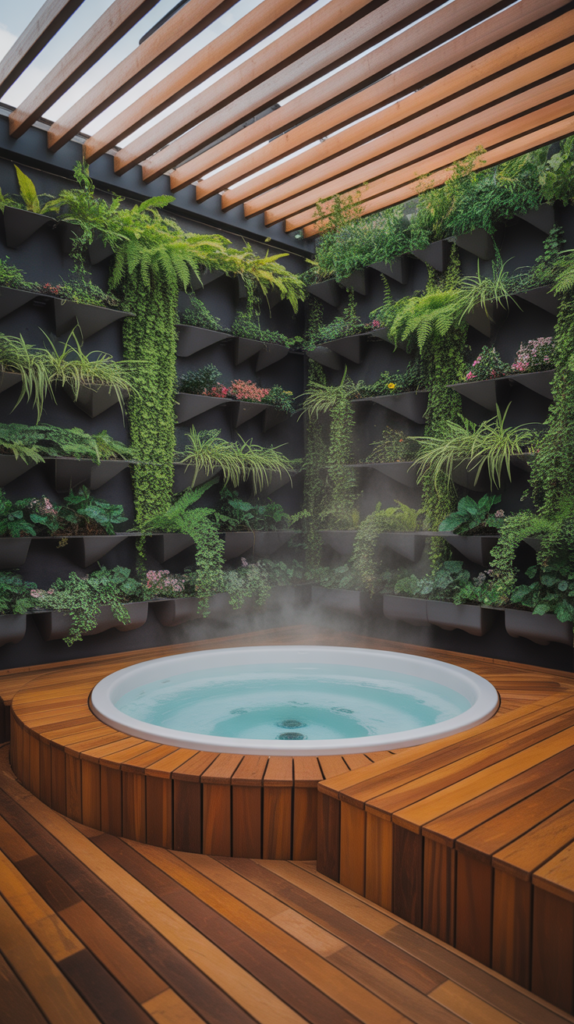 Courtyard terraces shine with wood decking and a centered jacuzzi. Vertical plants save space while adding greenery.