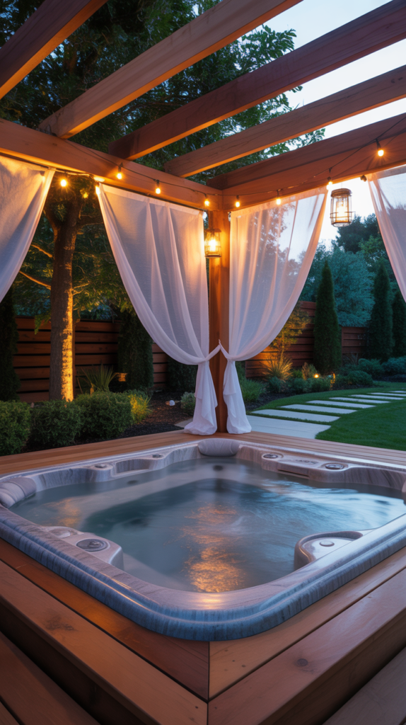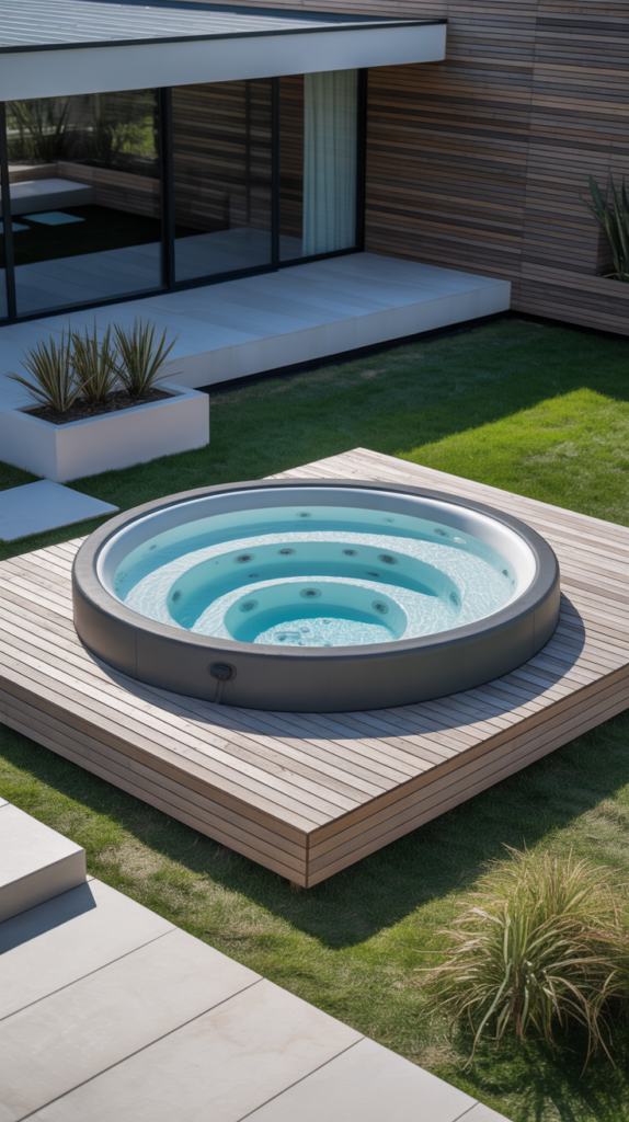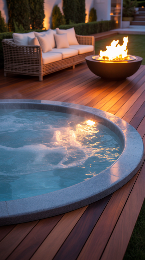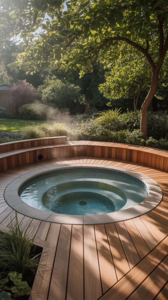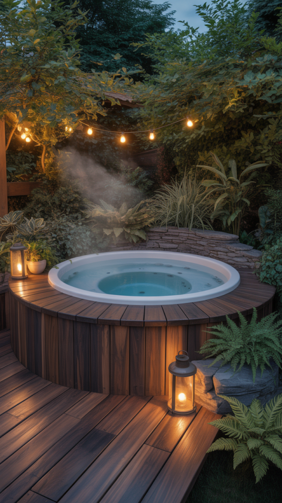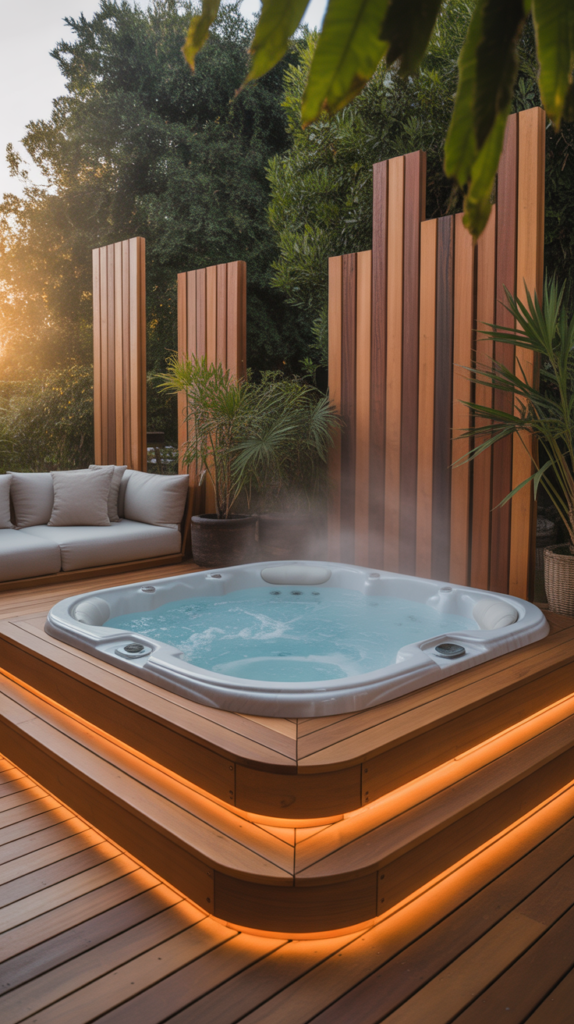 This idea works well for apartments or compact homes because it uses every inch wisely. It’s a cost-effective way to enjoy spa comfort outdoors. With proper sealing, wood decking lasts for years, making this a smart investment for daily relaxation.