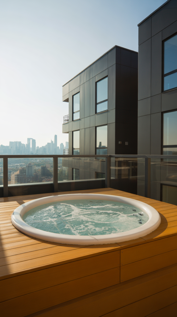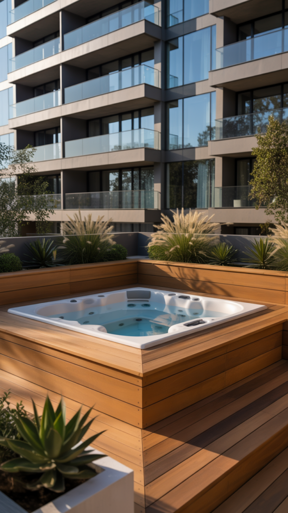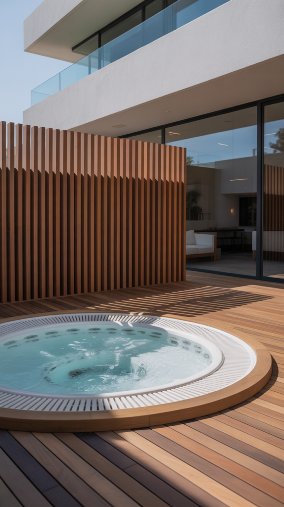 Even balconies can fit a compact jacuzzi with slim wood decking. Light-colored boards help brighten the area and make it feel larger. This setup is ideal for urban homes.