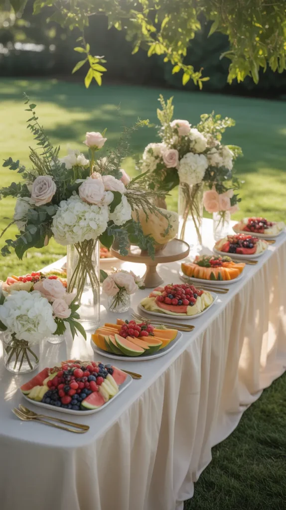 A baby shower brunch is practical and easy to host outdoors. Set up buffet tables with breakfast dishes, fruit platters, and drinks. Keep decor simple with soft colors and fresh flowers.