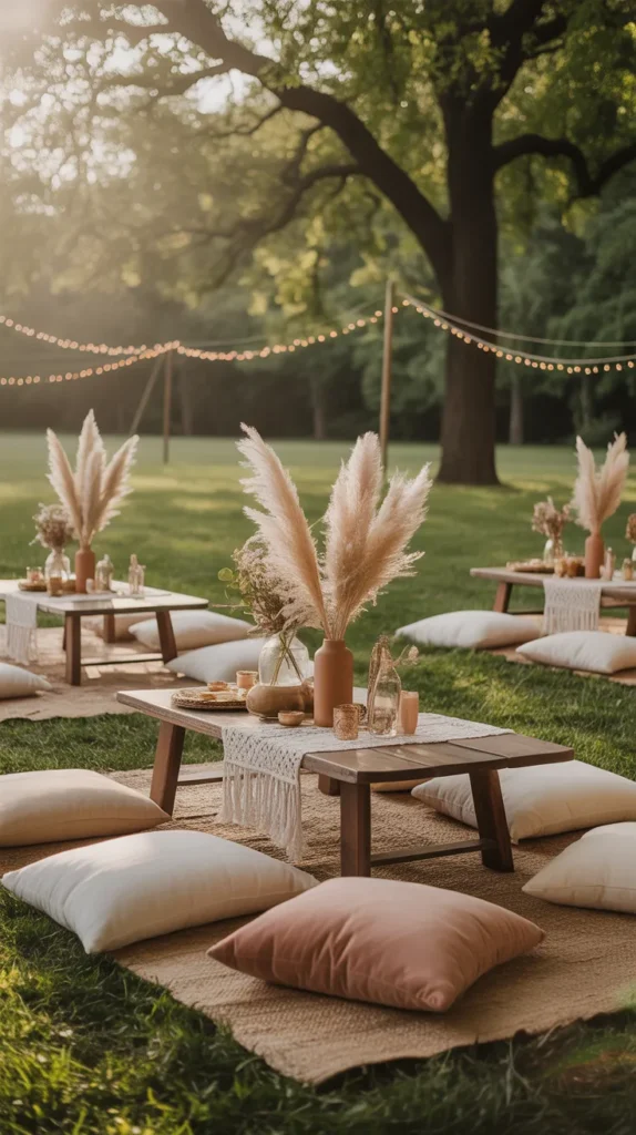 A boho picnic baby shower is perfect for a park or open lawn. Use low picnic tables, floor cushions, woven rugs, and neutral tones like beige and blush. Add dried flowers and pampas grass for a trendy look that feels stylish but relaxed.