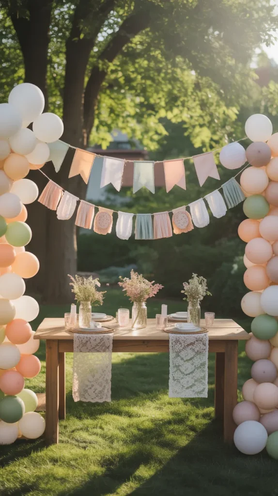 A backyard garden baby shower is one of the most popular outdoor baby shower ideas. Use fresh flowers, greenery, and soft pastel table settings to create a warm and welcoming space. You can decorate with mason jars, string lights, and simple balloon garlands to keep the setup affordable and beautiful.